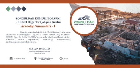 Zonguldak Kömür Jeoparkı, Kültürel Değerler Çalışma Grubu, Arkeoloji Sunumları - 1, 14.06.2022 Salı günü, saat 15:00'te Atatürk Kültür Merkezi Brifing Salonu'nda yapılacaktır. Doç. Dr. F. Gülden EKMEN, Doç. Dr. Hamza EKMEN, Doç. Dr. Şahin YILDIRIM'ın sunumlarıyla Zonguldak'ın kültürel mirasının önemli değerlerinin anlatılacağı konferans gerçekleştirilecektir.