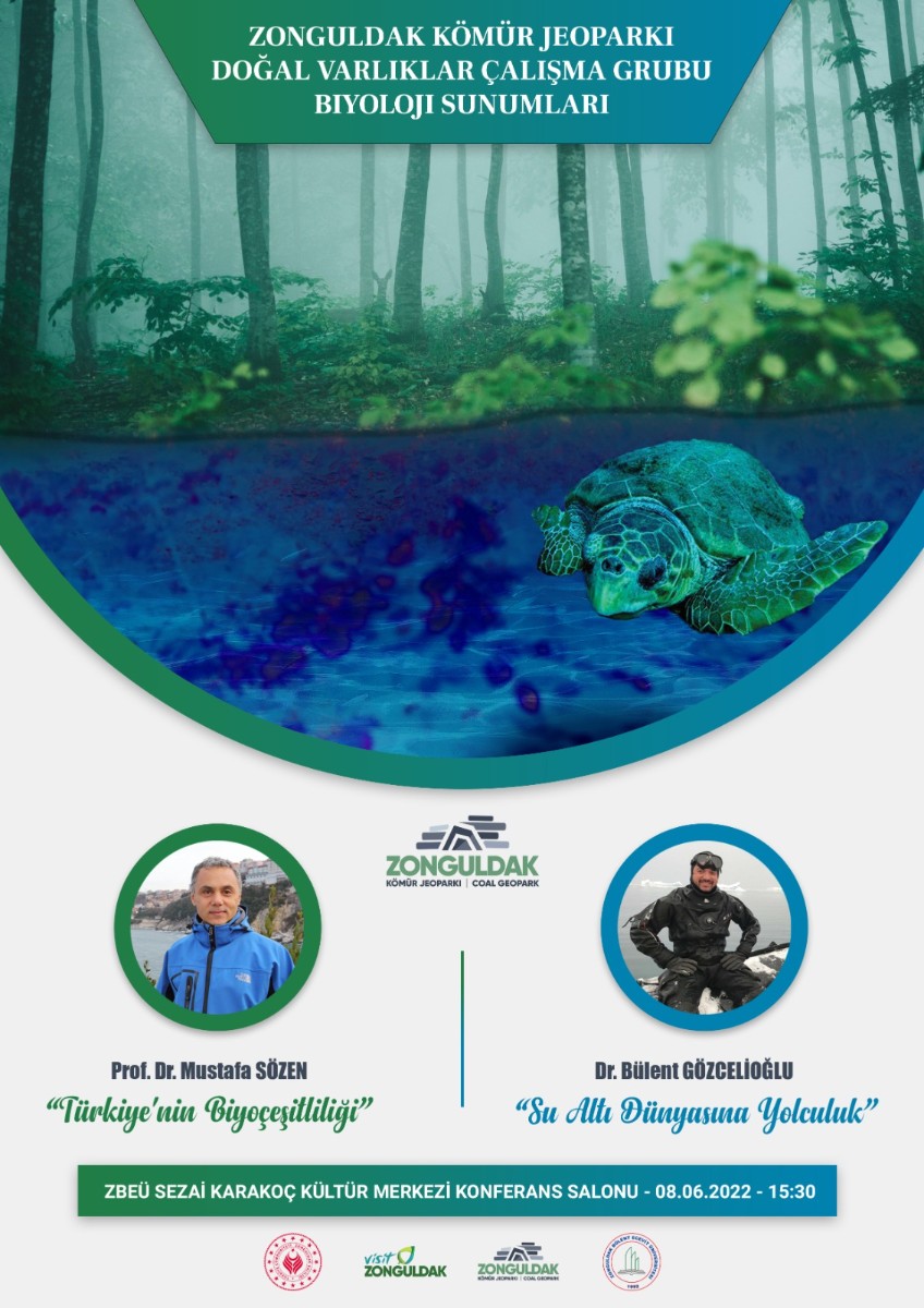 Zonguldak Kömür Jeoparkı, Doğal Varlıklar Çalışma Grubu, Biyoloji Sunumlarının ilki, 08.06.2022 Çarşamba günü, saat 15.30'te, ZBEÜ Sezai KARAKOÇ Konferans Salonu'nda yapılacaktır. ZBEÜ Fen-Edebiyat Fakültesi Öğretim Üyesi Sayın Prof. Dr. Mustafa SÖZEN "Türkiye'de Biyoçeşitlilik", TÜBİTAK Personeli Sayın Dr. Bülent GÖZCELİOĞLU ise "Su Altı Dünyasına Yolculuk" başlıklı sunumlarını gerçekleştireceklerdir.