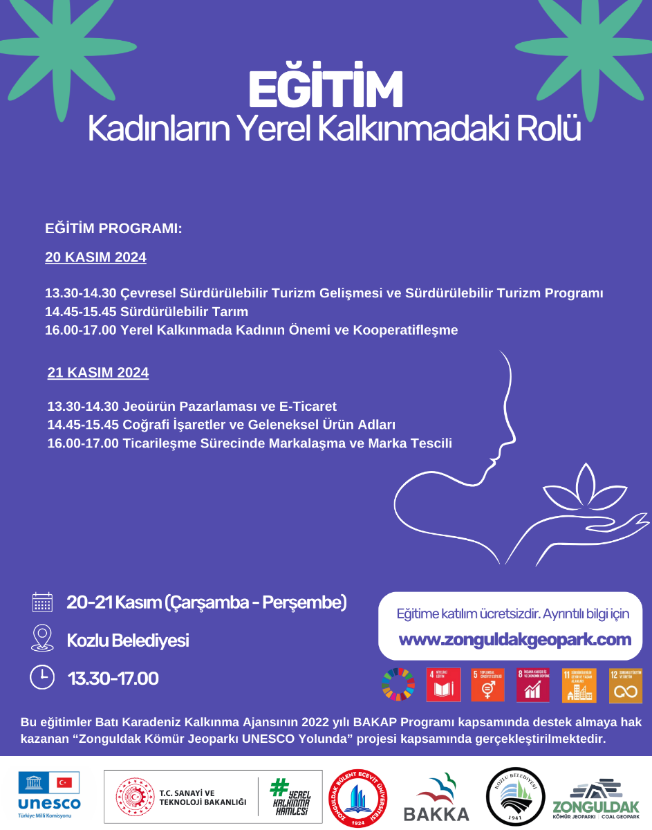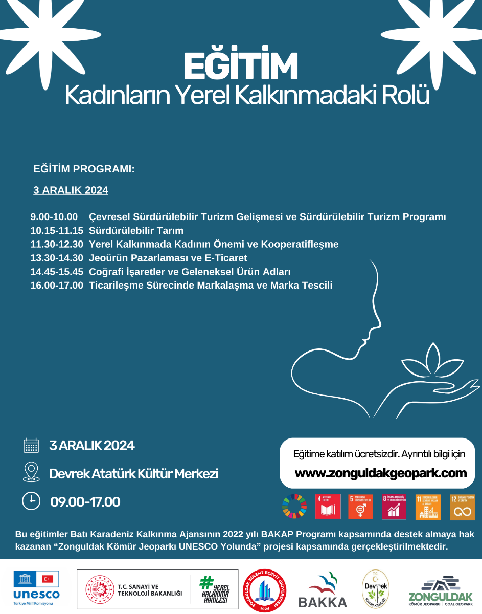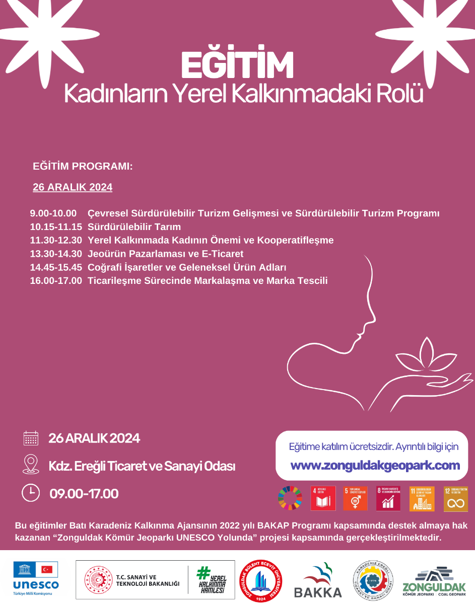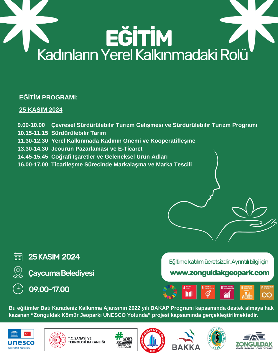 Kdz. Ereğli, Çaycuma, Devrek, Kozlu ve Zonguldak Merkez ilçelerinde yapılacak olan söz konusu eğitimlerle ilgili bilgiler afişlerde yer almaktadır. Jeopark gönüllüsü tüm kadınlar davetlidir.