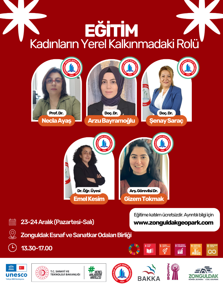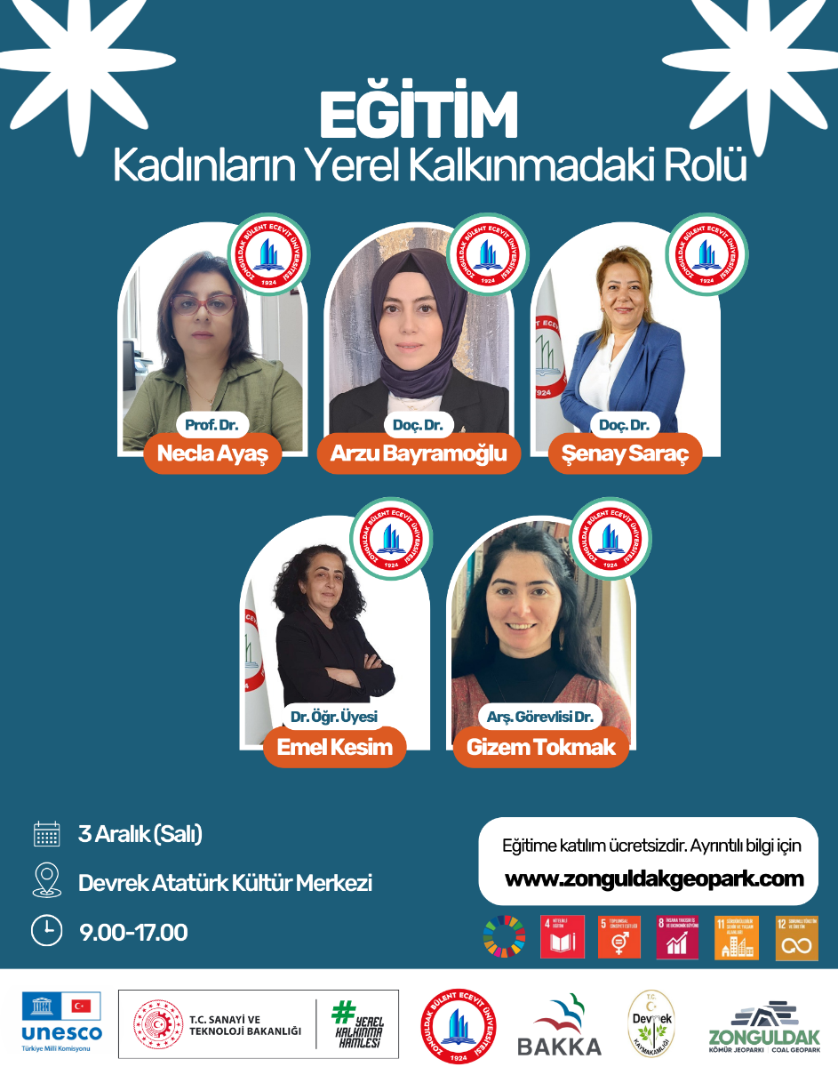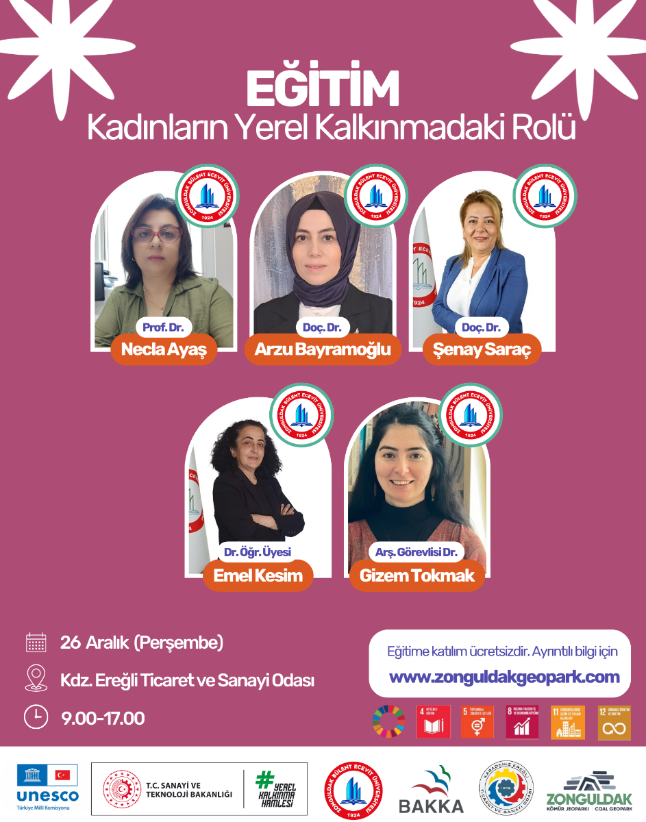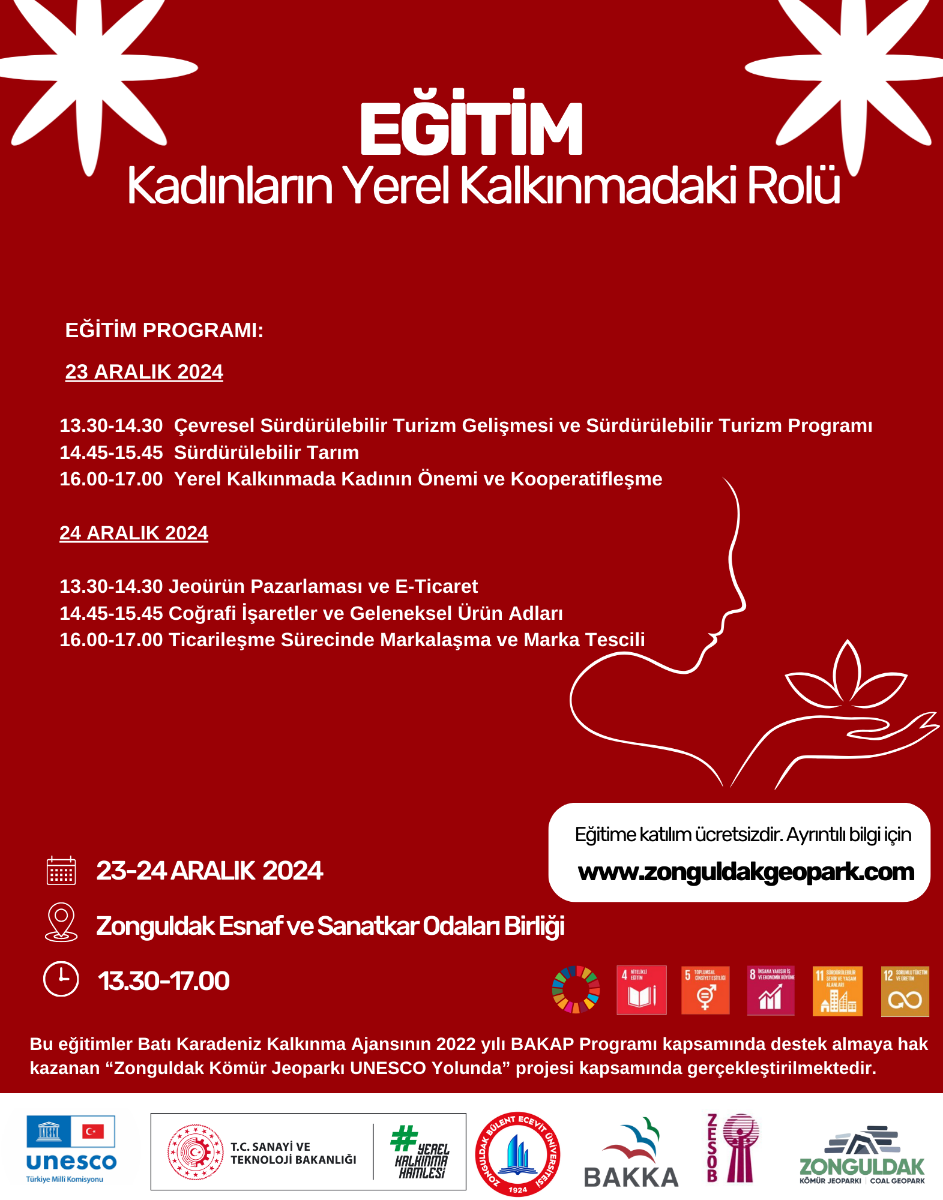 Kdz. Ereğli, Çaycuma, Devrek, Kozlu ve Zonguldak Merkez ilçelerinde yapılacak olan söz konusu eğitimlerle ilgili bilgiler afişlerde yer almaktadır. Jeopark gönüllüsü tüm kadınlar davetlidir.